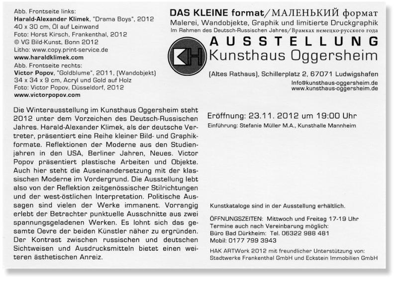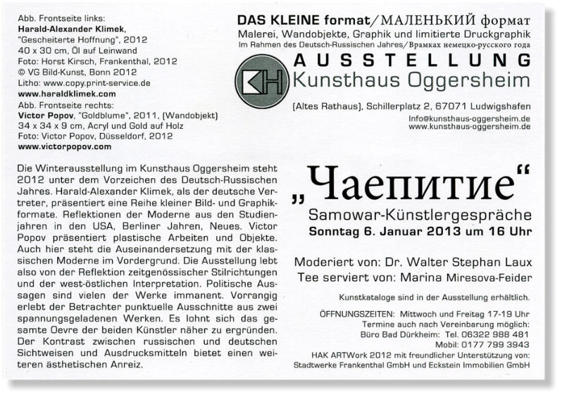 Heute Abend wird mit den Werken von Harald-Alexander Klimek und Victor Popov „im kleinen Format“ eine Art „musée imaginaire“ eingeweiht. Wie Sie bereits