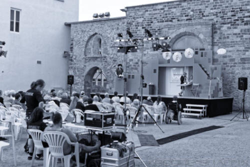 Tom Pfeifer und Ensemble, in der Erkenbert-Ruine.